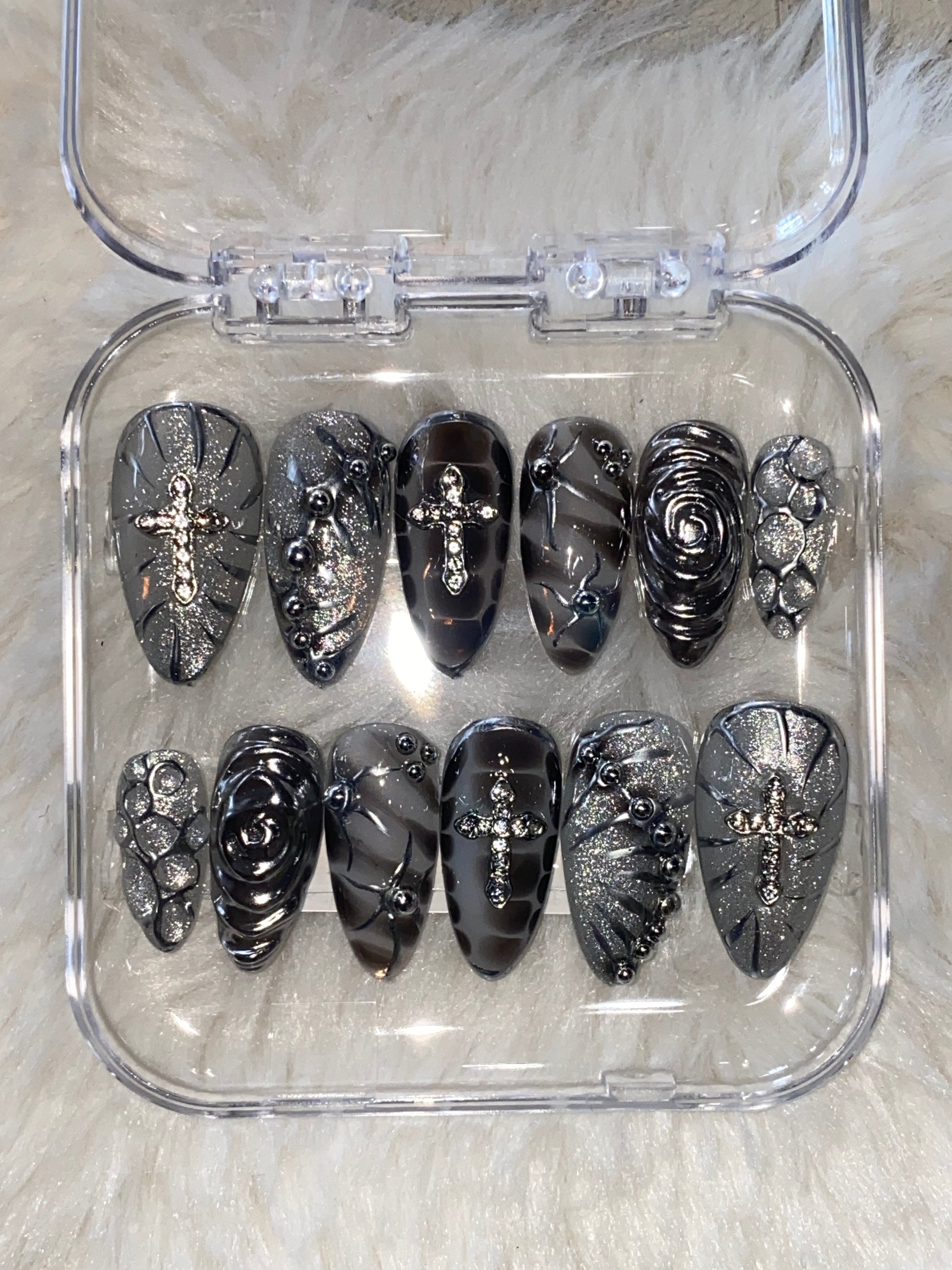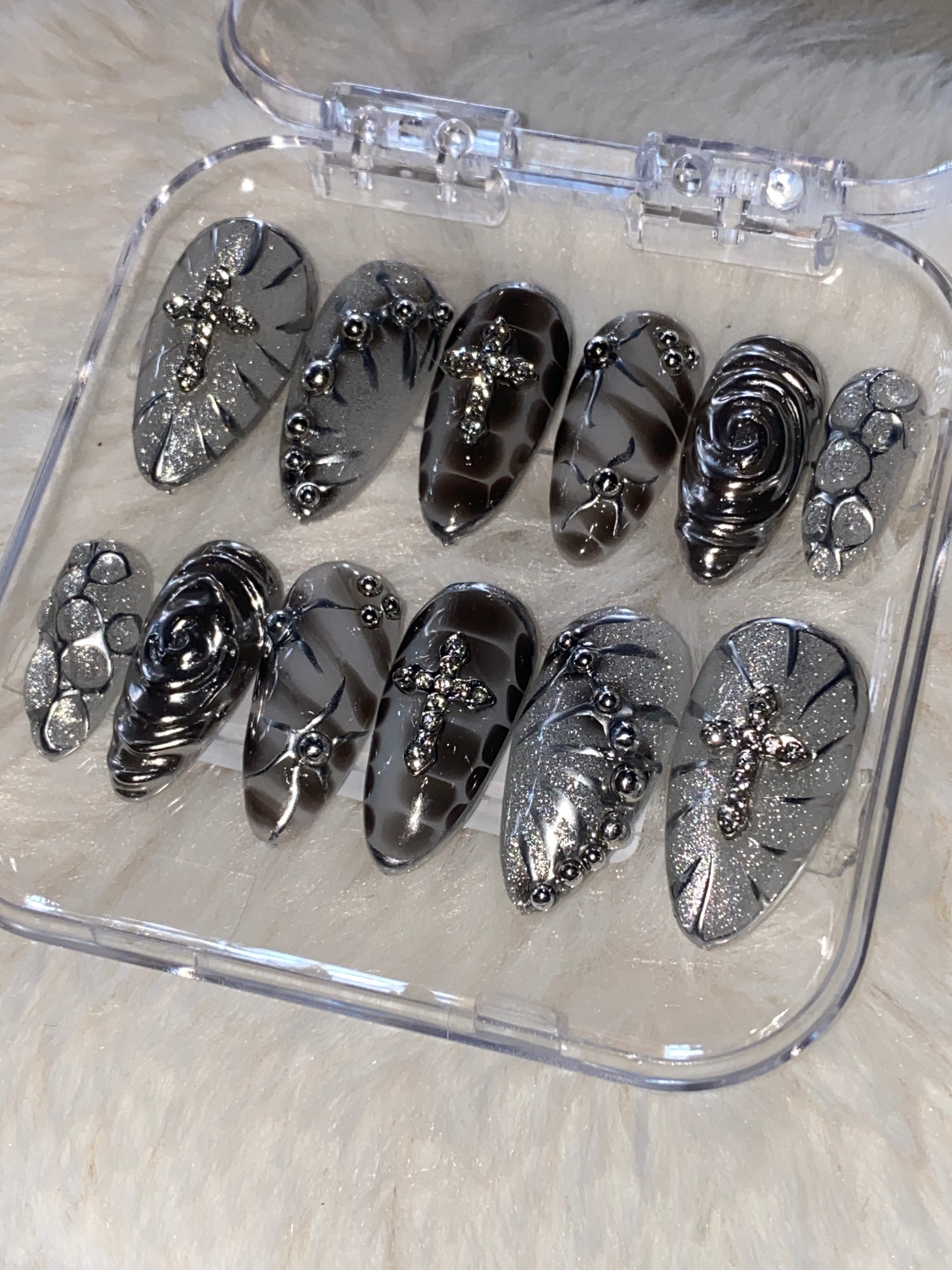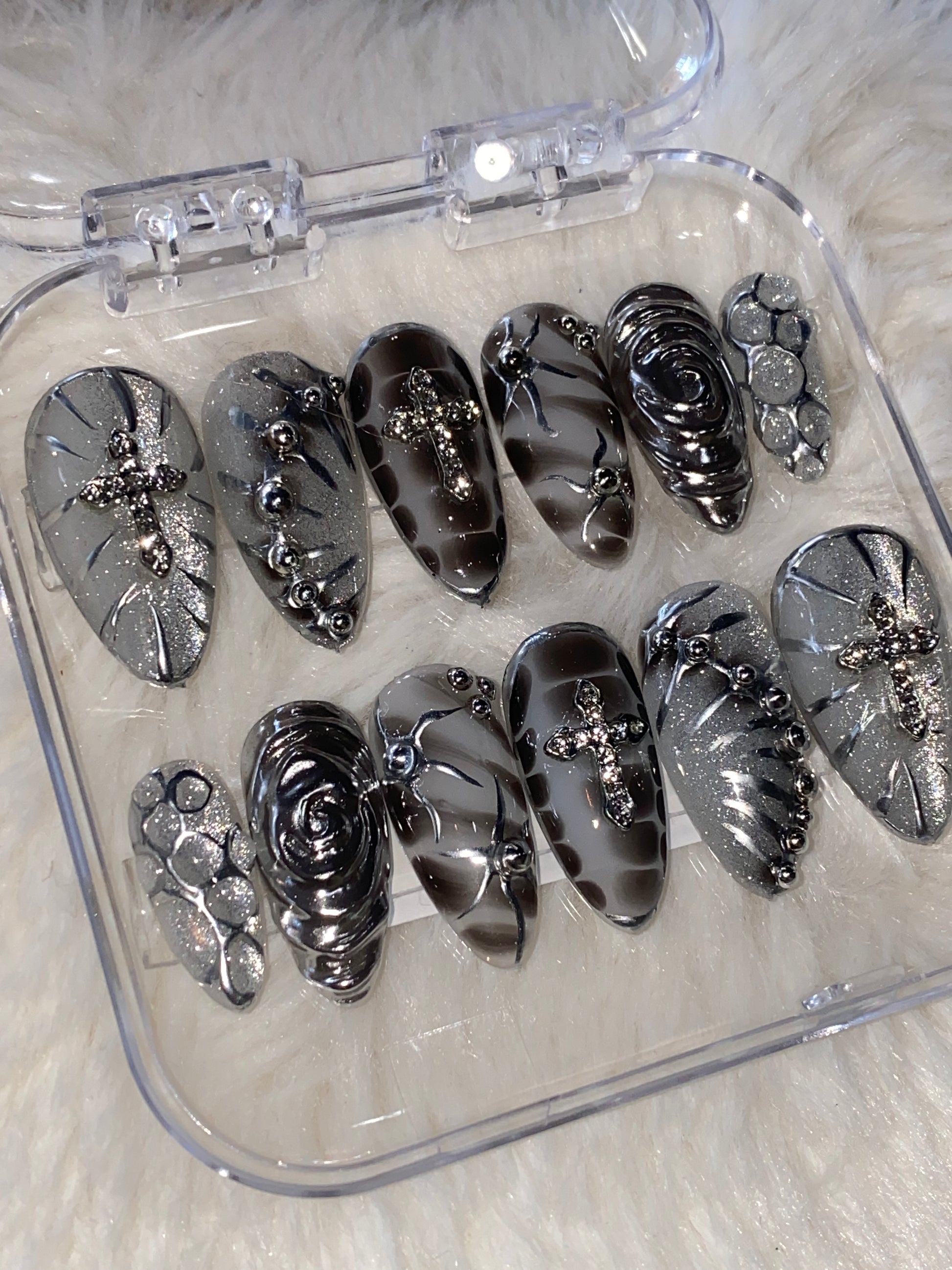 Milky white nails with dark grey blooming gel design. Decorated with 3D chrome and round rhinestones