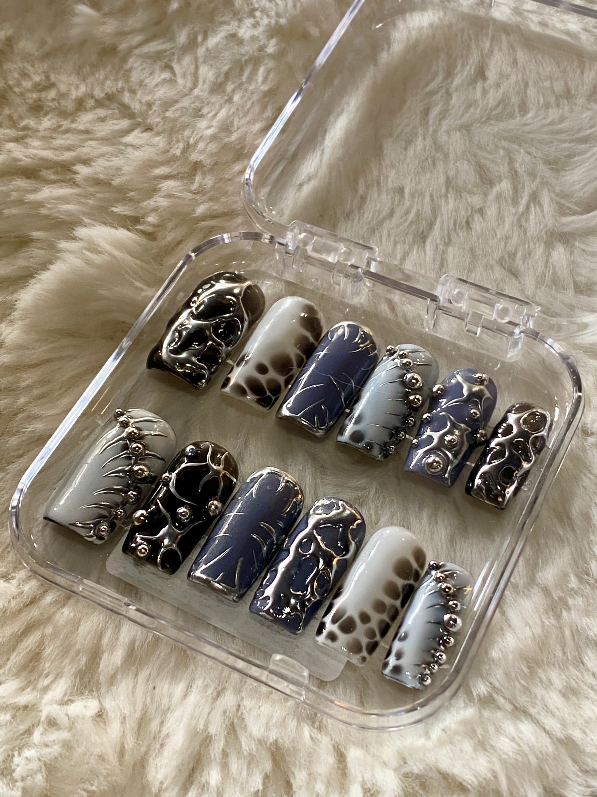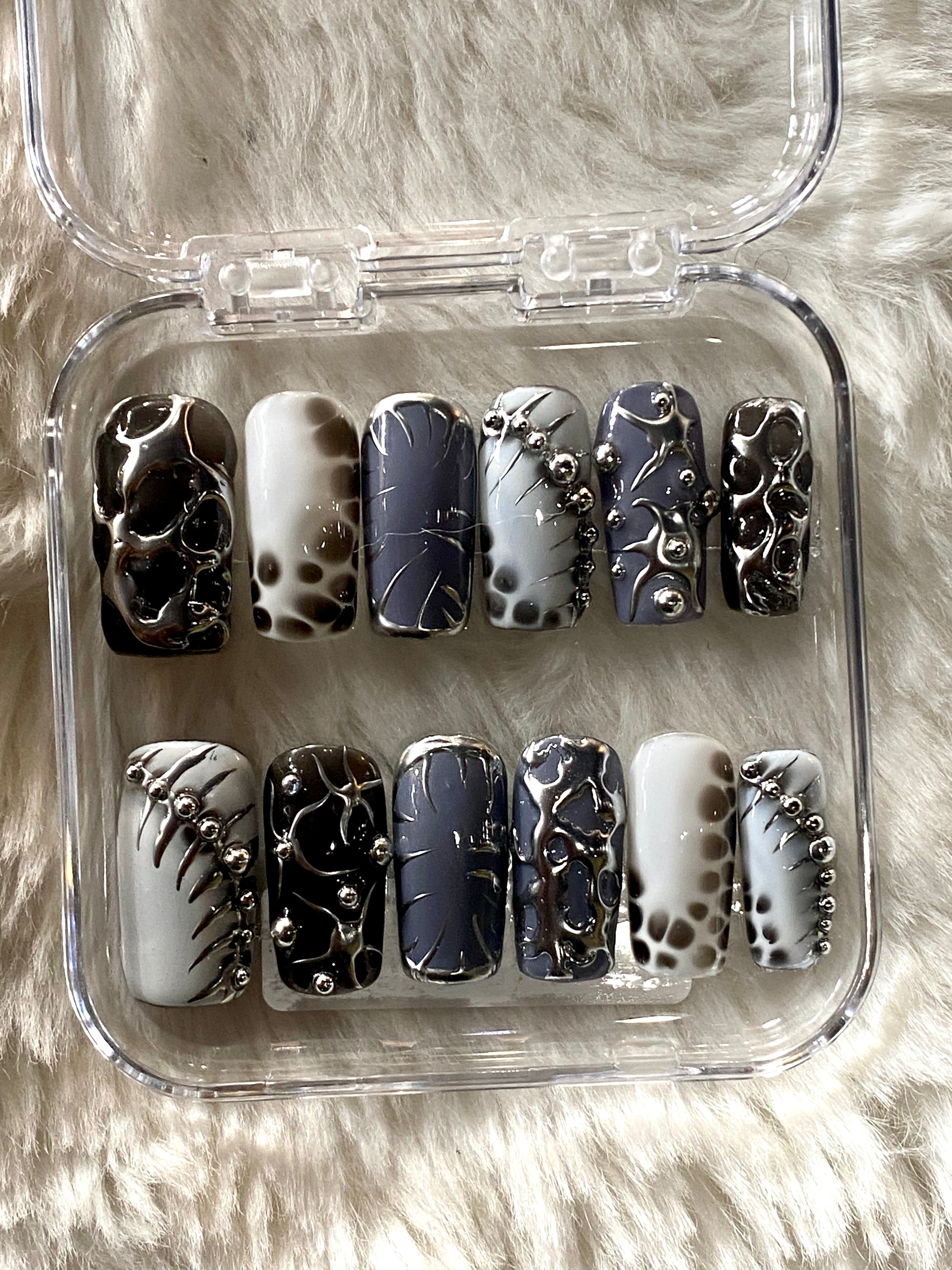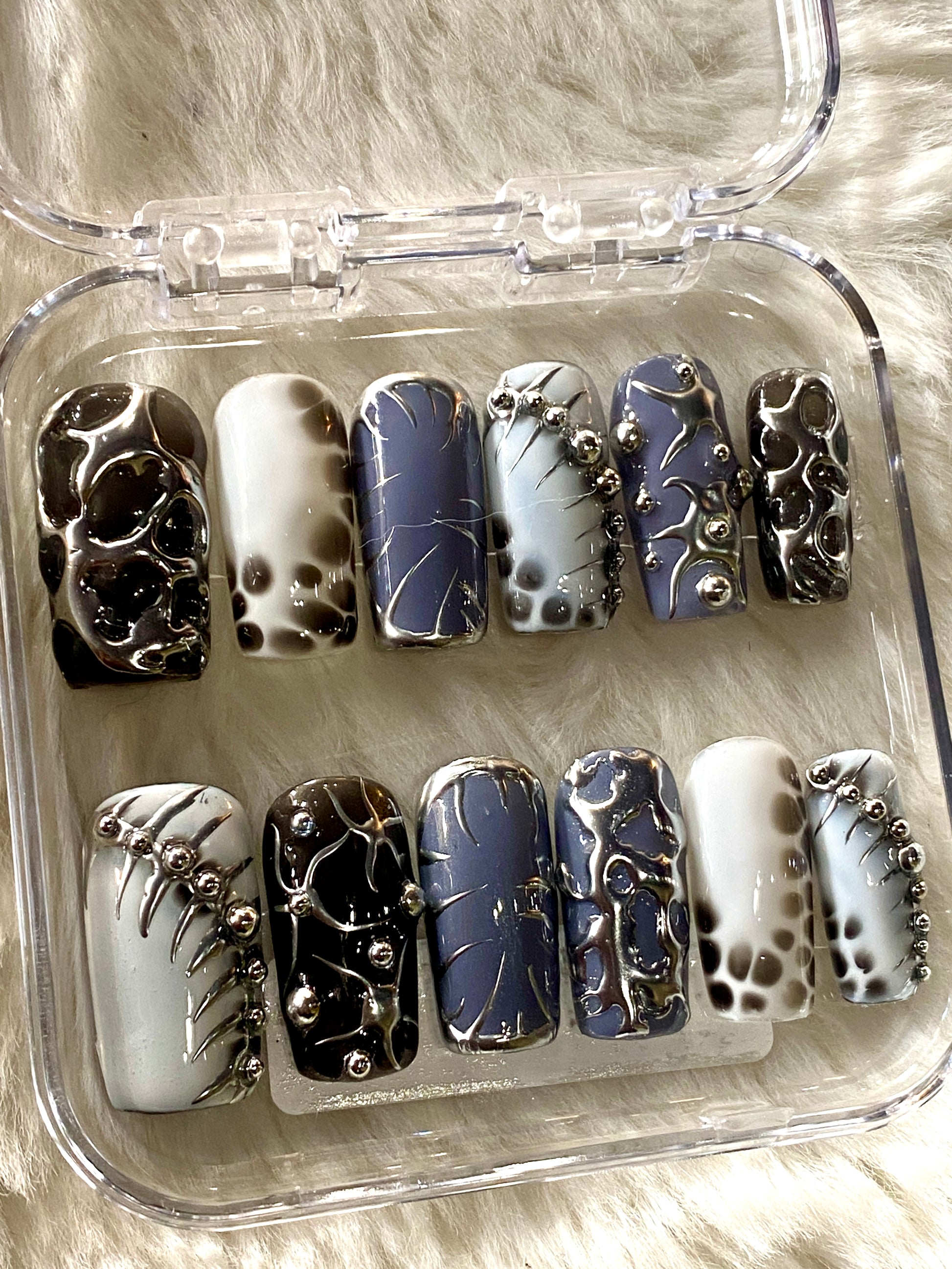Inspired by the futuristic aesthetic of the 90’s. This set has a grayish blue, white and grey base with rounded rhinestones, 3D chrome and blooming gel design
